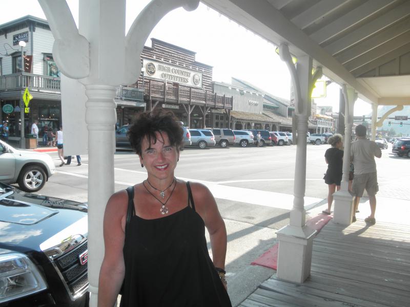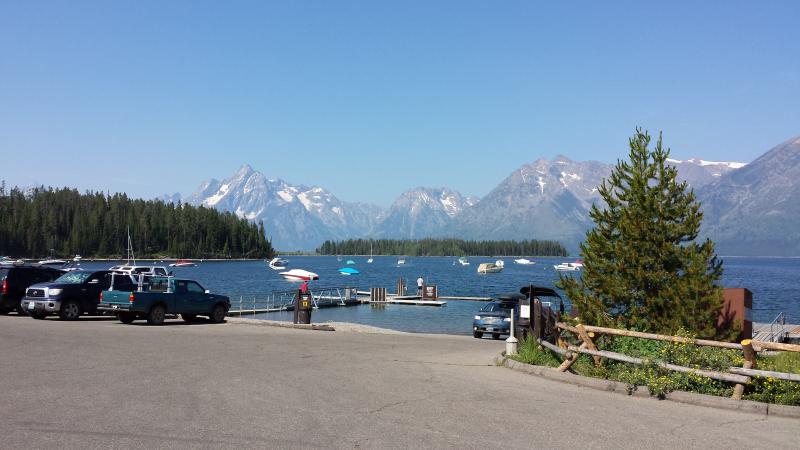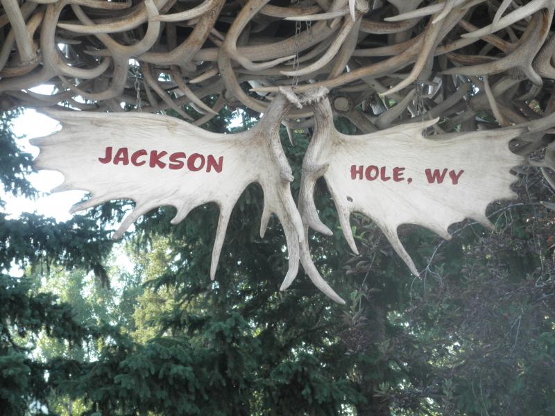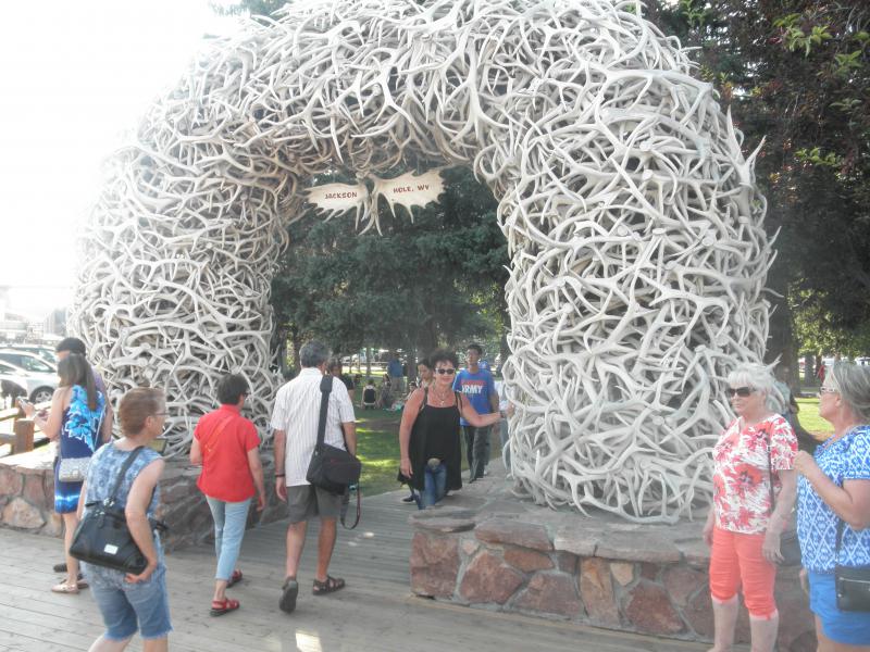 Über den John D. Rockefeller Jr. Memorial Parkway näherten wir uns dem Jackson Lake. Entlang des Seeufers luden schöne Picknickplätze zum Verweilen ein, und so beschlossen wir, uns im nächsten Markt mit Lebensmitteln einzudecken. Irgendwie waren wir aber vom Pech verfolgt, denn ab nun kam kein einziger freier Picknickplatz mehr. Wir bogen in die Strasse zum Jenny Lake ein, aber auch hier - kein einziger freier Platz! Der Park war dermaßen überfüllt mit Besuchern. Und anstatt unser Lunch am Seeufer zu genießen, waren wir plötzlich in Jackson Hole. Natürlich viel zu früh um unser Zimmer zu beziehen. Sabine hatte die Idee, sich am angrenzenden Campingplatz niederzulassen. Gesagt, getan... Wir parkten unseren Jeep an einem voll ausgestatteten Wohnmobilparkplatz, in der Hoffnung, dass nicht unbedingt gleich eines dieser riesigen Mobilhomes ankommen würde. Im kühlen Schatten eines Baumes packten wir also unsere Brotzeit aus und fühlten uns wie richtige Camper. Die anwesenden Nachbarn begrüßten uns freundlich, und so konnten wir die zwei Stunden, bis unser Zimmer bezugsfertig war, richtig chillig verbringen.