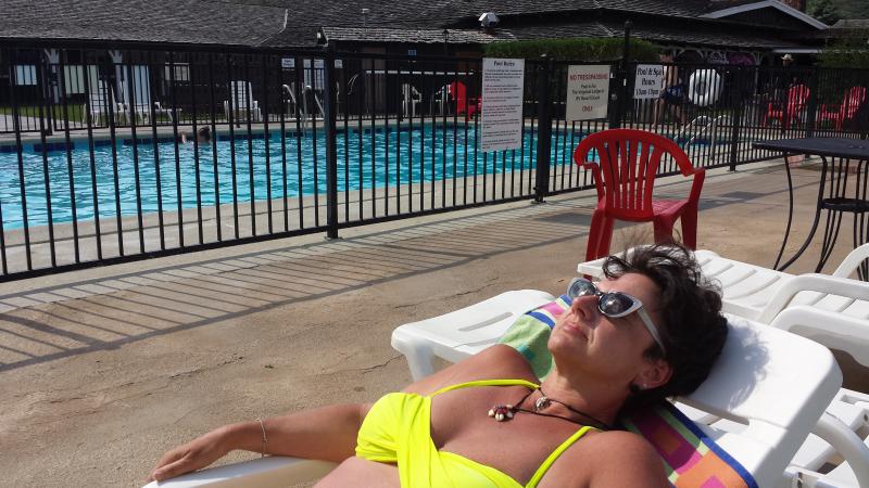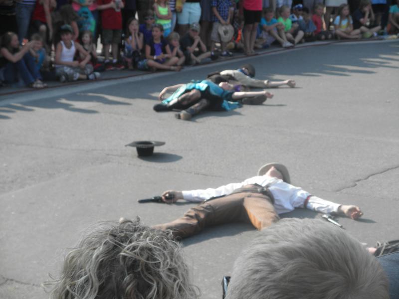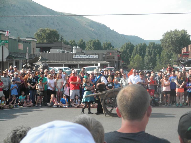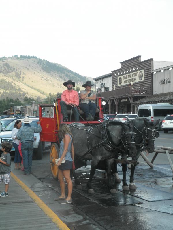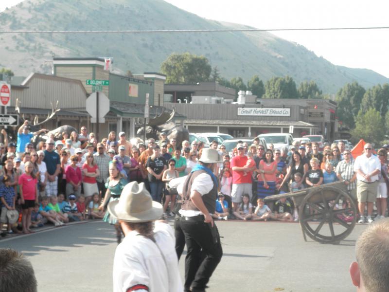 Den heißen Nachmittag verbrachten wir am schönen Pool der Virginian Lodge. Abends gingen wir dann nach Jackson. Pünktlich um 18.00 Uhr findet dort täglich das berühmte Shoot-Out statt. Ein paar Cowboys und Can-Can-Mädchen liefern sich wilde Wortgefechte und eine krachende Schießerei, an deren Ende dann alle erschossen auf dem Boden liegen. Naja, eine Touristenattraktion halt. Aber Jackson Hole hat schon noch den ursprünglichen Wild-West-Charme, ohne wirklich kitschig zu wirken. Uns hat's jedenfalls sehr gut gefallen. Nach dem Abendessen waren wir noch auf einen Absacker im Saloon der Virginian Lodge, wo es sich bei rockiger Livemusik und einem kühlen Bier gut aushalten ließ.