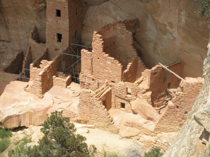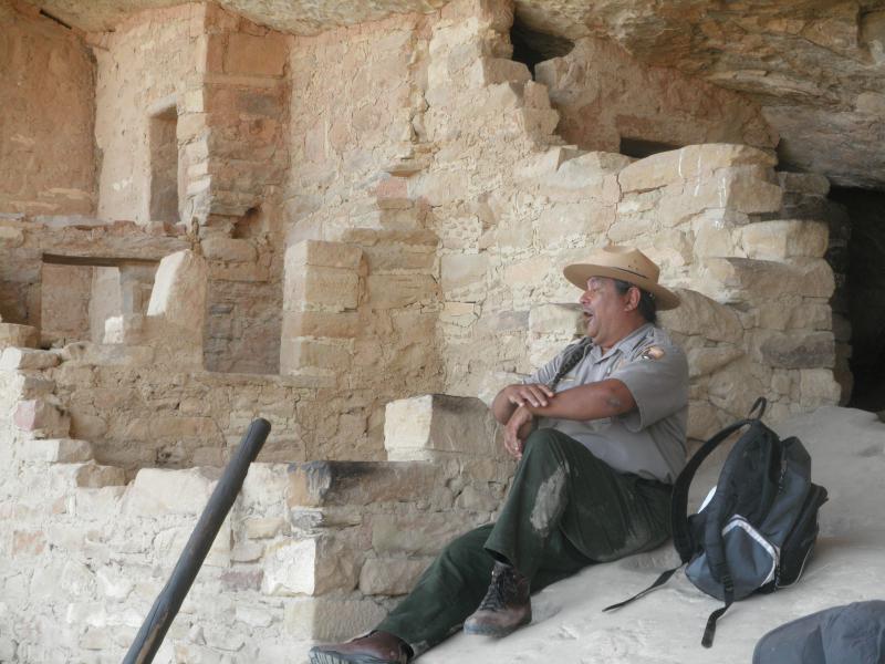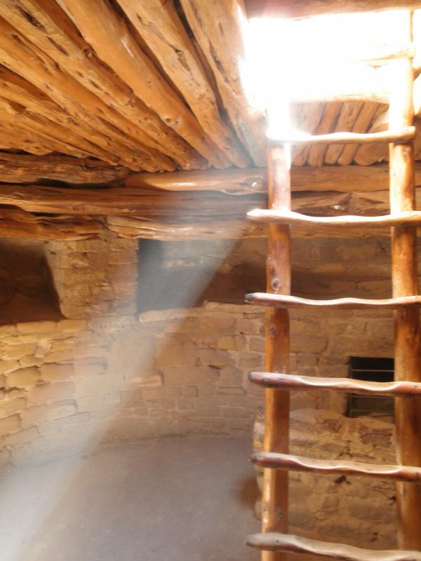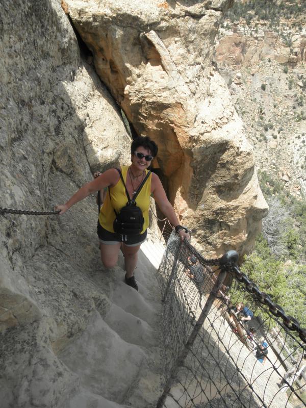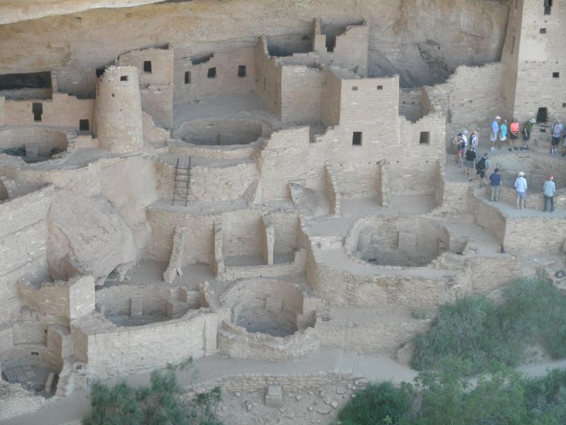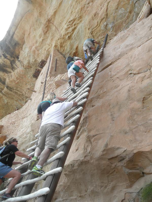 Schon die Anfahrt über steile Serpentinen war recht eindrucksvoll. Kilometerweite Sicht in alle Himmelsrichtungen. Am Mesa angekommen fuhren wir zuerst die verschiedenen Aussichtspunkte an. Die Tickets für die Führung des Balcony House hatten wir schon in Cortez besorgt, so dass wir nicht mehr extra irgendwo stehen bleiben mussten. Über einen kurzen Weg ging es an den Klippen vorbei zum Eingang des Balcony House. Eine fast 10m hohe, nahezu senkrechte Holzleiter wollte erklommen werden, um in die Felsensiedlung zu kommen. Unser Ranger klärte uns ausführlich über das Leben der ehemaligen Bewohner auf. Die interessante Führung dauerte gut 90 Minuten und endete an einem winzigen Loch.